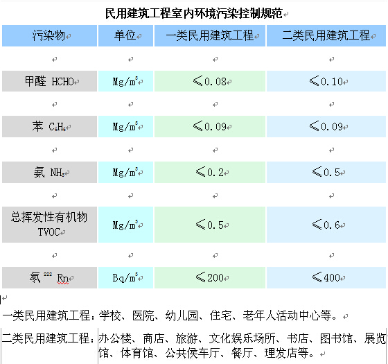 ———限量值不同,“規范”將限量值劃分為以住宅為主的Ⅰ類建筑和以辦公樓為主的Ⅱ類建筑,分別予以規定;“標準”則不進行劃分,采用統一的標準。“標準”中的限量值除氨外,其它值基本為“規范”的Ⅱ類建筑限量或介于兩類之間,而苯的限量值更大。